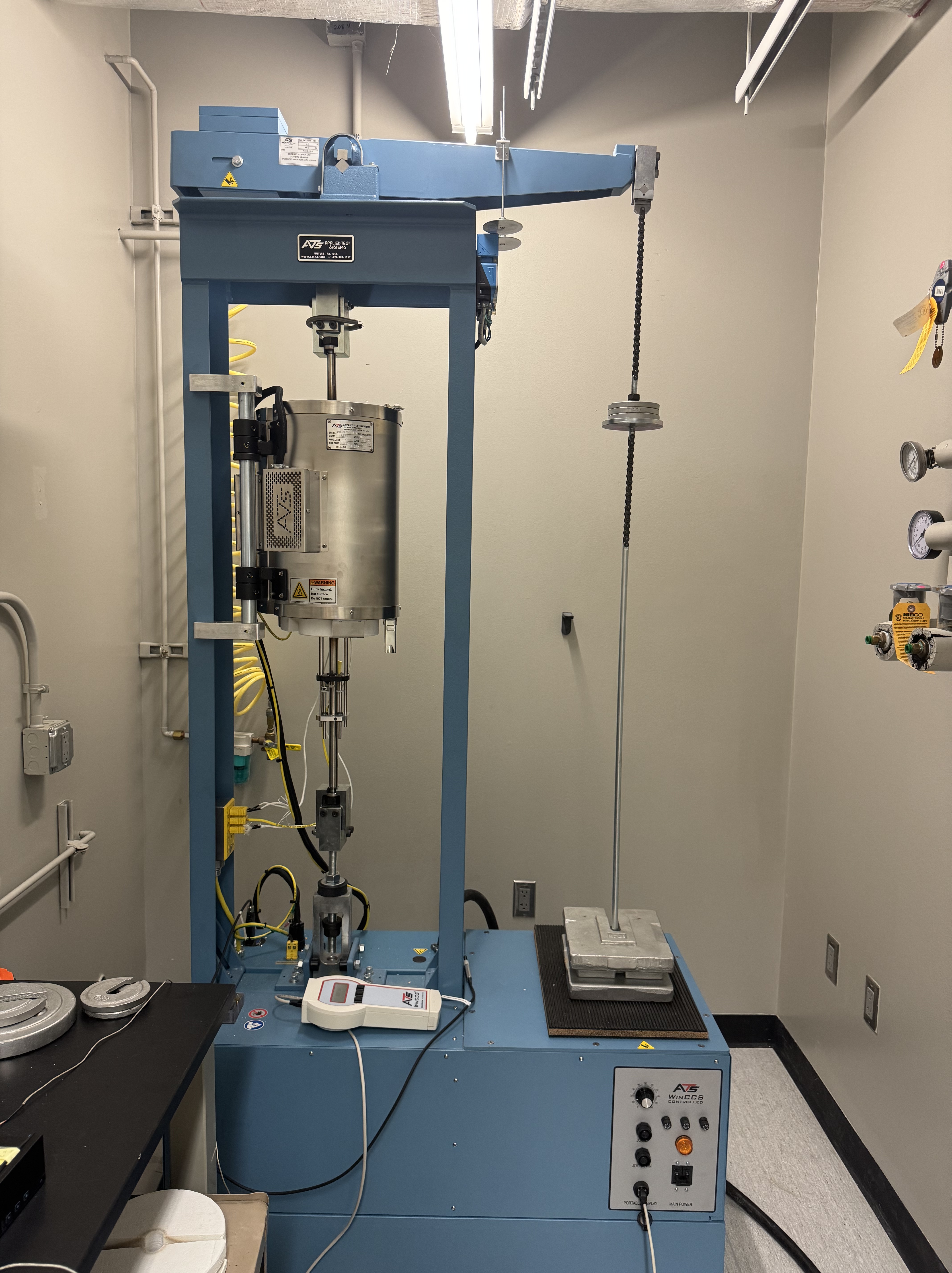 A high-temperature uniaxial creep apparatus. Load is applied to the sample by a 20:1 lever arm. The apparatus is equipped with a pull-to-push fixture, allowing for compressional deformation. A three-zone clamshell furnace surrounds the pull-to-push fixture, ensuring the sample remains at a stable prescribed temperature. Shortening of the sample is measured by a high-precision spring-loaded extensometer. WinCCS software provided by ATS facilitates apparatus control and temperature and displacement data collection.
