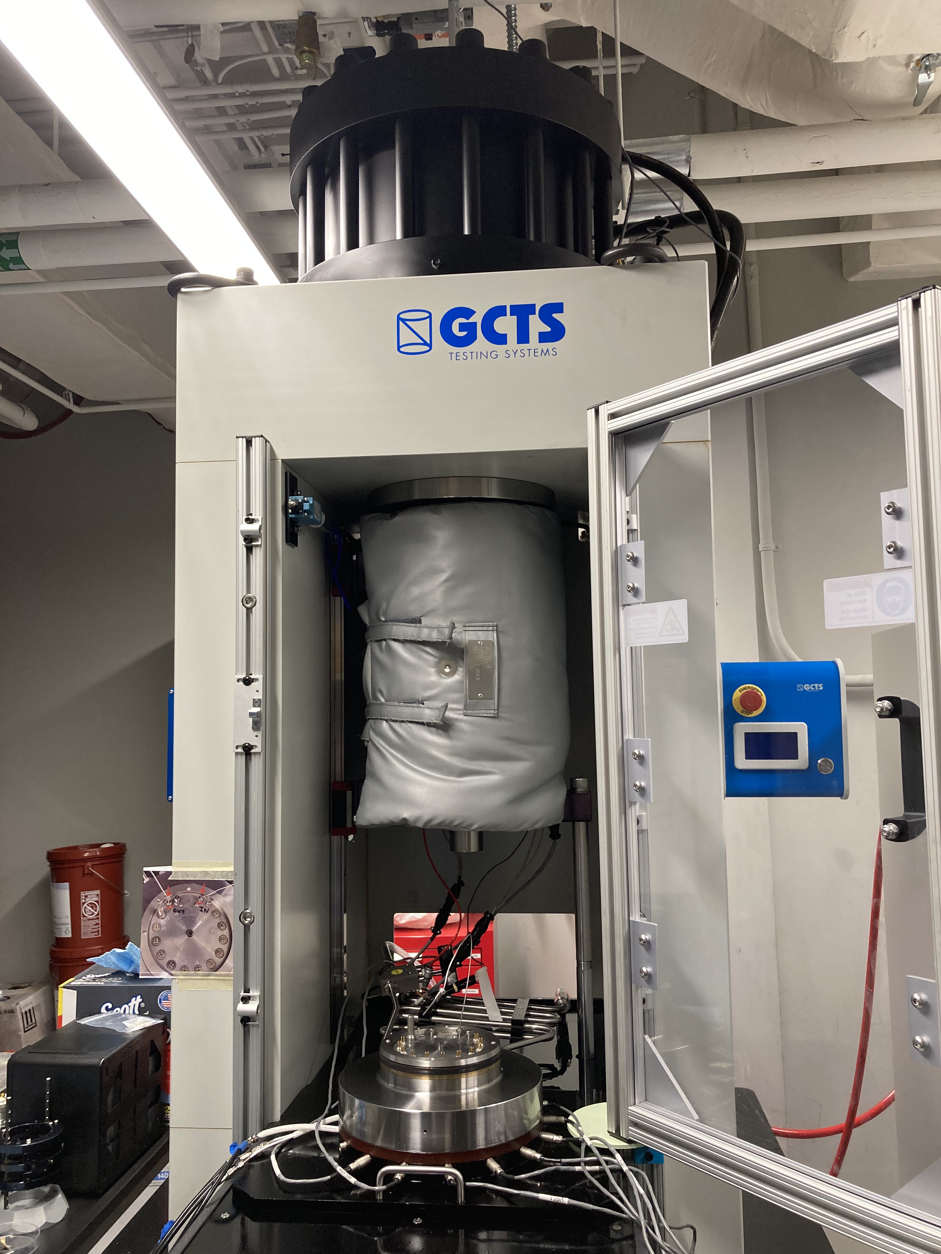 A hydraulic-driven, servo-controlled triaxial apparatus produced by GCTS. The apparatus is externally-heated and uses silicone oil as the confining medium. It has a two-sided pore-pressure system, which allows for independent control of pore fluid pressures and/or volumes on each side of the sample. We can switch between multiple internal load cells to maximize the sensitivity of load readings. The apparatus includes integrated digital signal conditioning and data collection and apparatus control use state-of-the-art CATS software provided by GCTS.