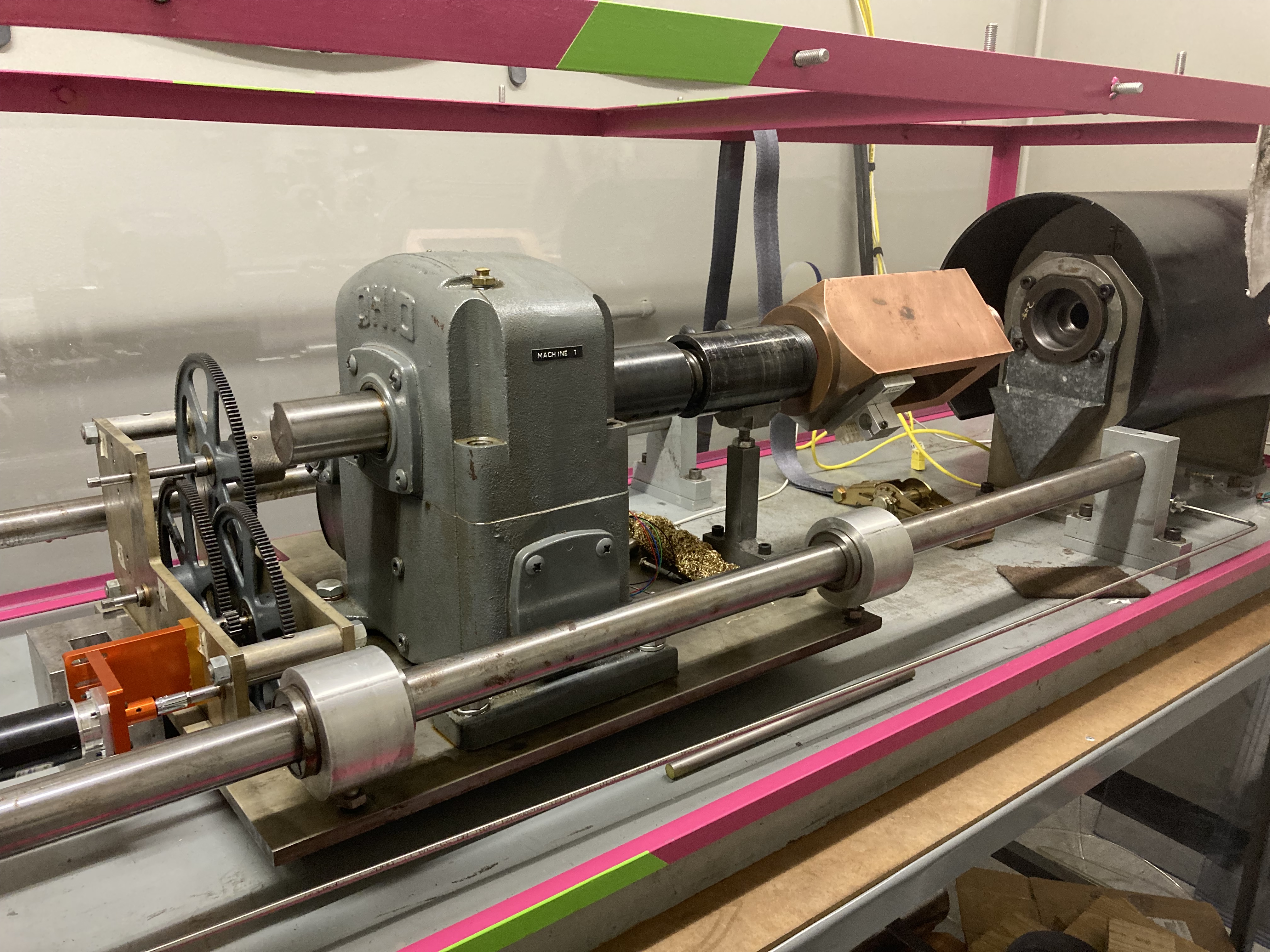 A gear-driven triaxial apparatus inherited from John Logan. This apparatus is externally-heated and uses a high-temperature heat transfer fluid as the confining medium, allowing for experiments up to 400oC. It is also equipped with a single-sided pore-pressure system so that pore fluid volume and pressure can be continuously monitored. A semi-internal load cell eliminates the effect of seal friction on mechanical results. Data collection via LabView program produced by Leeman Geophysical.